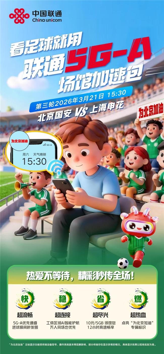 3月21日,北京工人体育场热血涌动、人声鼎沸,万众期待的中超联赛“京沪大战”在此激情上演——北京国安队坐镇主场迎战上海申花队。作为首都主导通信运营商、中超联赛官方赞助商,中国联通坚决贯彻落实“网络强国”“数字中国”“体育强国”国家战略,以高度的政治自觉与央企担当,依托领先的5G-A技术在赛场内外构建起全方位、立体化的智慧网络运营体系,以“高稳定、超高速、全场景”优质网络为现场数万名球迷带来极致畅快的观赛体验。