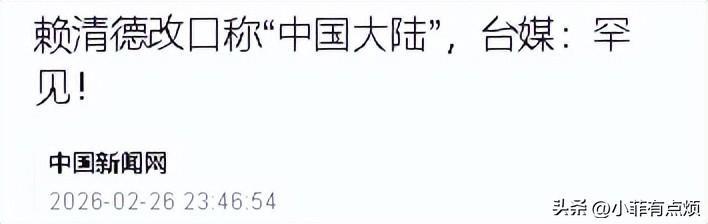 2026年2月24日,赖清德出席海基会的大陆台商春节活动时,罕见多次称“中国大陆”,还提及“善意”“理解”等词,语调放软了不少。